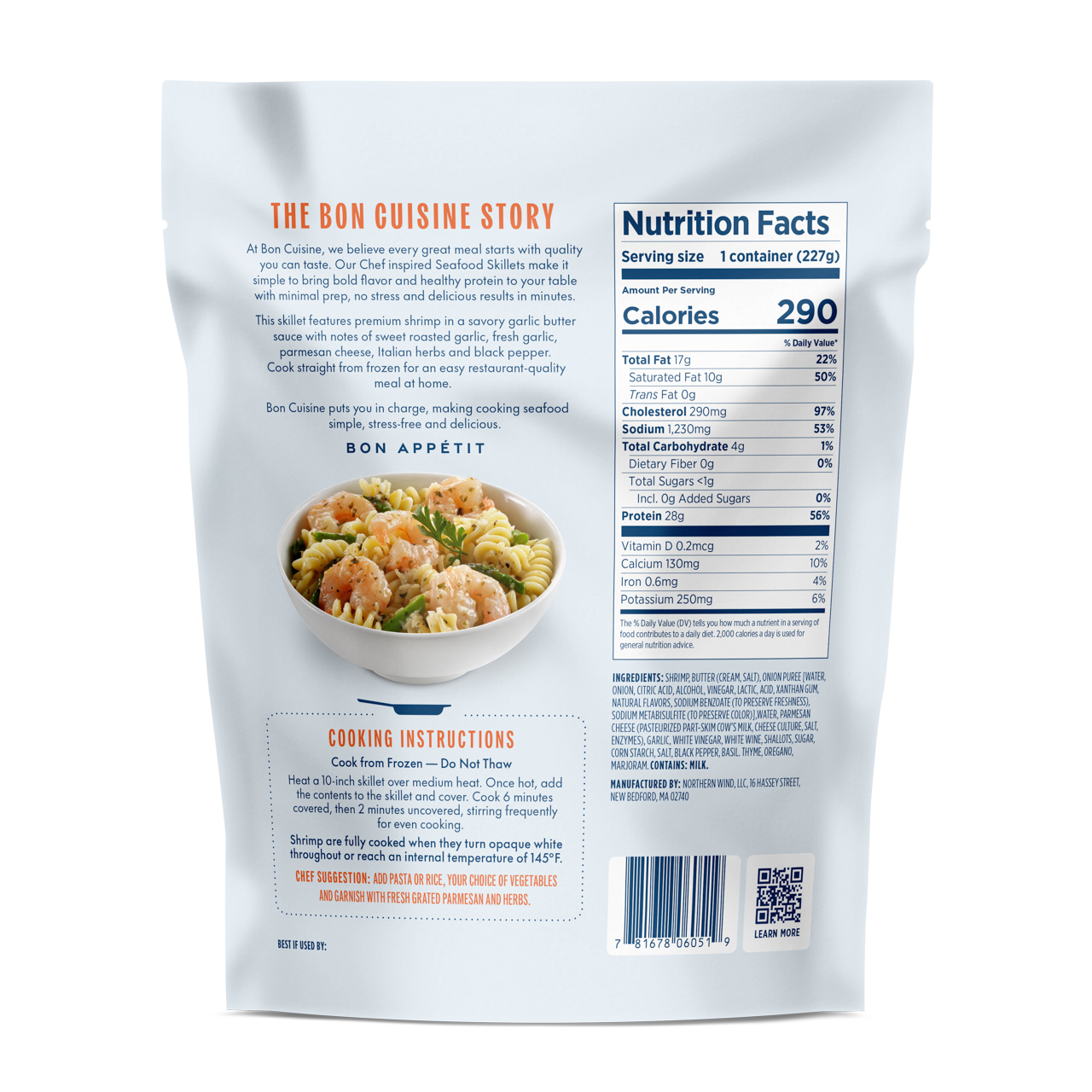 Delicious premium shrimp swim in a rich garlic butter bursting with roasted garlic sweetness, bold parmesan, fragrant Italian herbs and black pepper. Delivering 28 grams of protein per serving, this chef-created skillet cooks straight from frozen for effortless, restaurant-quality seafood at home.